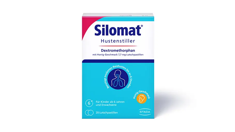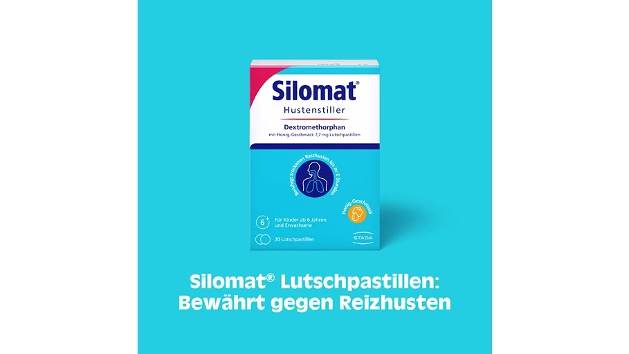 Mit den Silomat® Lutschpastillen wird das Gefühl, Husten zu müssen, durch den bewährten Wirkstoff Dextromethorphan zuverlässig reduziert. Die Lutschpastillen enthalten zusätzlich den natürlichen Inhaltsstoff Gummi arabicum. Dadurch kann schon das Lutschen eine erste Linderung vermitteln. So kann der Körper zur Ruhe kommen und die Schleimhäute können sich regenerieren.