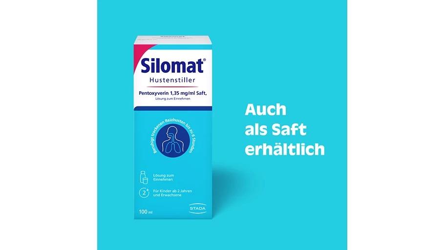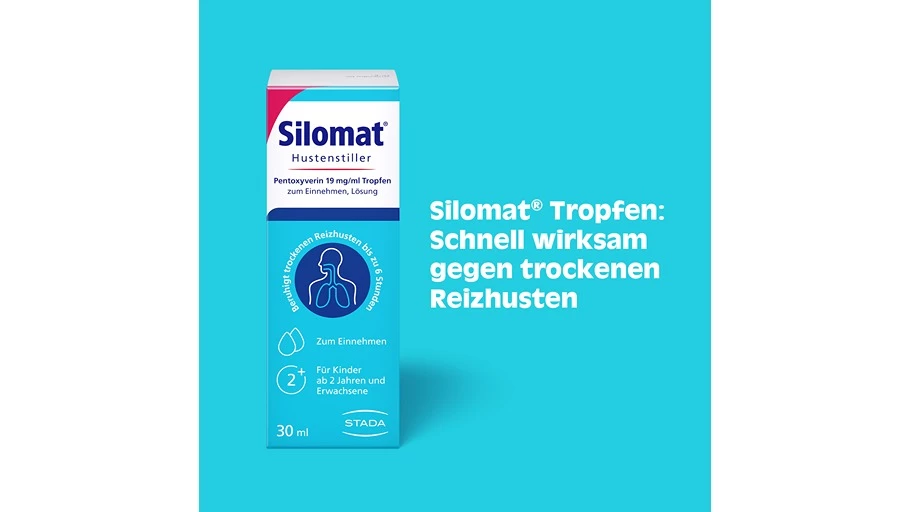 Die Silomat® Pentoxyverin Tropfen wirken schnell nach nur 10 bis 20 Minuten und haben eine langanhaltende Wirkdauer von 4 bis 6 Stunden. Die Hustentropfen bei Reizhusten eignen sich für Erwachsene und Kinder ab 2 Jahren – frei von Alkohol, Zucker und Farbstoffen. Der Wirkstoff ist gut verträglich und somit auch für Patienten mit Asthma und Diabetes geeignet.